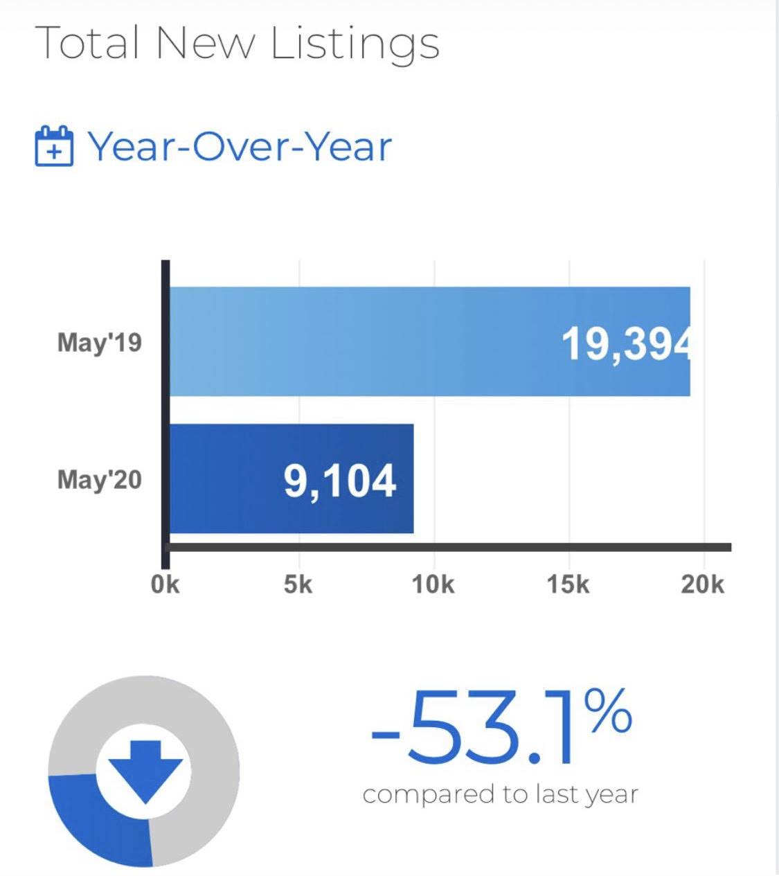 The number of new listings entered into TRREB’s MLS® System in May was down by a similar annual rate to that of sales, dipping by 53.1 per cent to 9,104. On a month-over-month basis, actual new listings were up by 47.5 per cent.